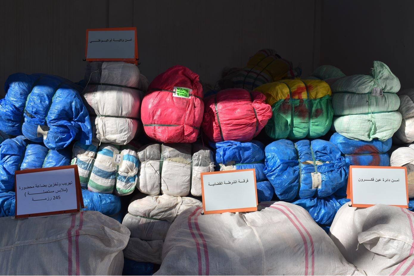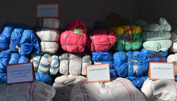 هذا وقد تم وضع خطة عمل ميدانية وبالتنسق الدائم والمستمر مع النيابة المحلية تم تفتيش المستودع أين تم ضبط بداخله 245 رزمة من مختلف الأحجام والأوزان لألبسة مستعملة، مع توقيف أربعة أشخاص تتراوح أعمارهم بين 28 و 60 سنة، وبعد التحقيق في القضية تبين أن هذه المحجوزات محل تهريب .