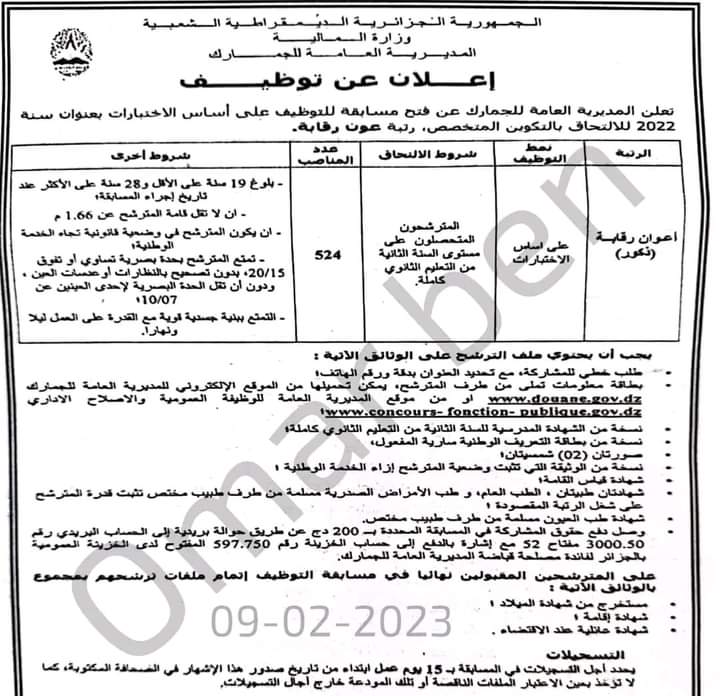أعلنت المديرية العامة للجمارك، فتح مسابقة لتوظيف 524 عون رقابة (ذكور) سنة 2022.