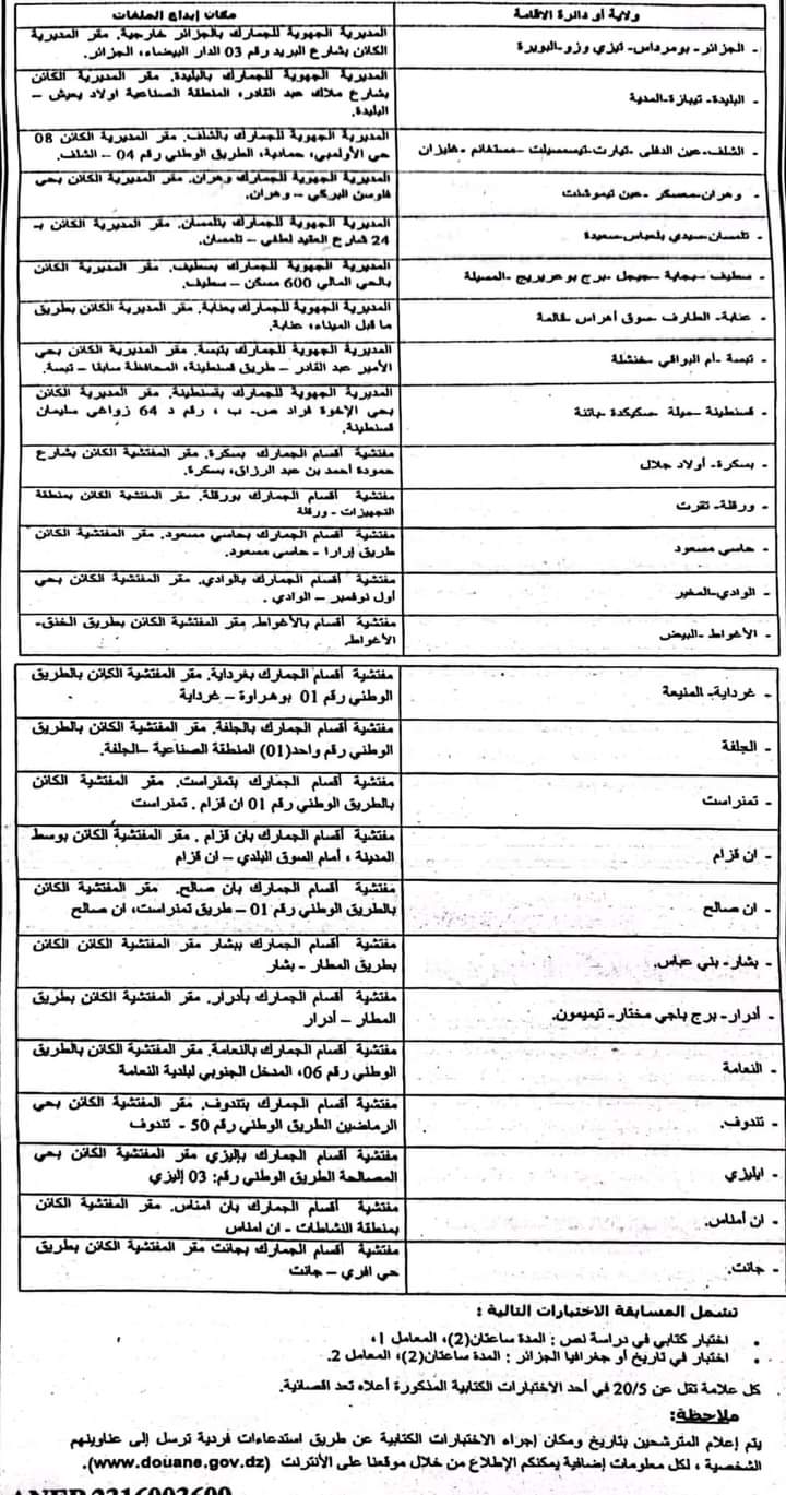 أفادت المديرية، في بيان لها ، أنه لتحميل “استمارة التسجيل” والإطلاع على شروط وكيفيات التسجيل المعلومات المتعلقة بإيداع ملفات الترشح، يرجى زيارة الموقع الرسمي للجمارك الجزائرية عبر الرابطين الإلكترونيين.