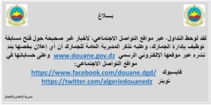 و نشرت ذات المصالح ، على صفحتها الرسمية عبر الفايسبوك اليوم: ” لقد لوحظ تداول أخبار غير صحيحة عبر مواقع التواصل الإجتماعي، حول فتح مسابقة توظيف بإدارة الجمارك، وعليه تذكر المديرية العامة للجمارك أن أي إعلان يخصها يتم نشره عبر موقعها الإلكتروني الرسمي، وعبر حساباتها الرسمية على مواقع التواصل الإجتماعي”.