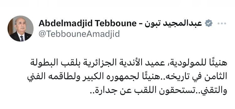وكتب الرئيس تبون في حسابه عبر منصة “ تويتر ” : “هنيئًا للمولودية، عميد الأندية الجزائرية بلقب البطولة الثامن في تاريخه…هنيئًا لجمهوره الكبير ولطاقمه الفني والتقني…تستحقون اللقب عن جدارة..”.