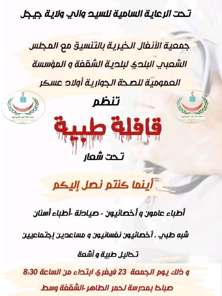 نظمت جمعية الأنفال الخيرية وتحت اشراف والي جيجل وبالتنسيق مع مديرية الصحة والسكان لولاية جبجل ممثلة في المؤسسة العمومية للصحة الجوارية بوسيف أولاد عسكر وبلدية الشقفة قافلة تضامنية طبية لفائدة المرضى المسنين وكبار السن، حيث تم إحصاء أزيد من 1000 عملية فحص مست شرائح مختلفة من مواطني هاتين البلديتين وذلك من قبل 09 أطباء أخصائيين متطوعين وطبيبين عامين وجراحي أسنان وصيدليين وغيرهم، حيث عرفت القافلة إقبالا كبيرا للمرضى من مختلف مشاتي البلديتين أين تم تسجيل طوابير عديدة خاصة أمام أطباء العيون والعظام والقلب والأطفال وغيرها.