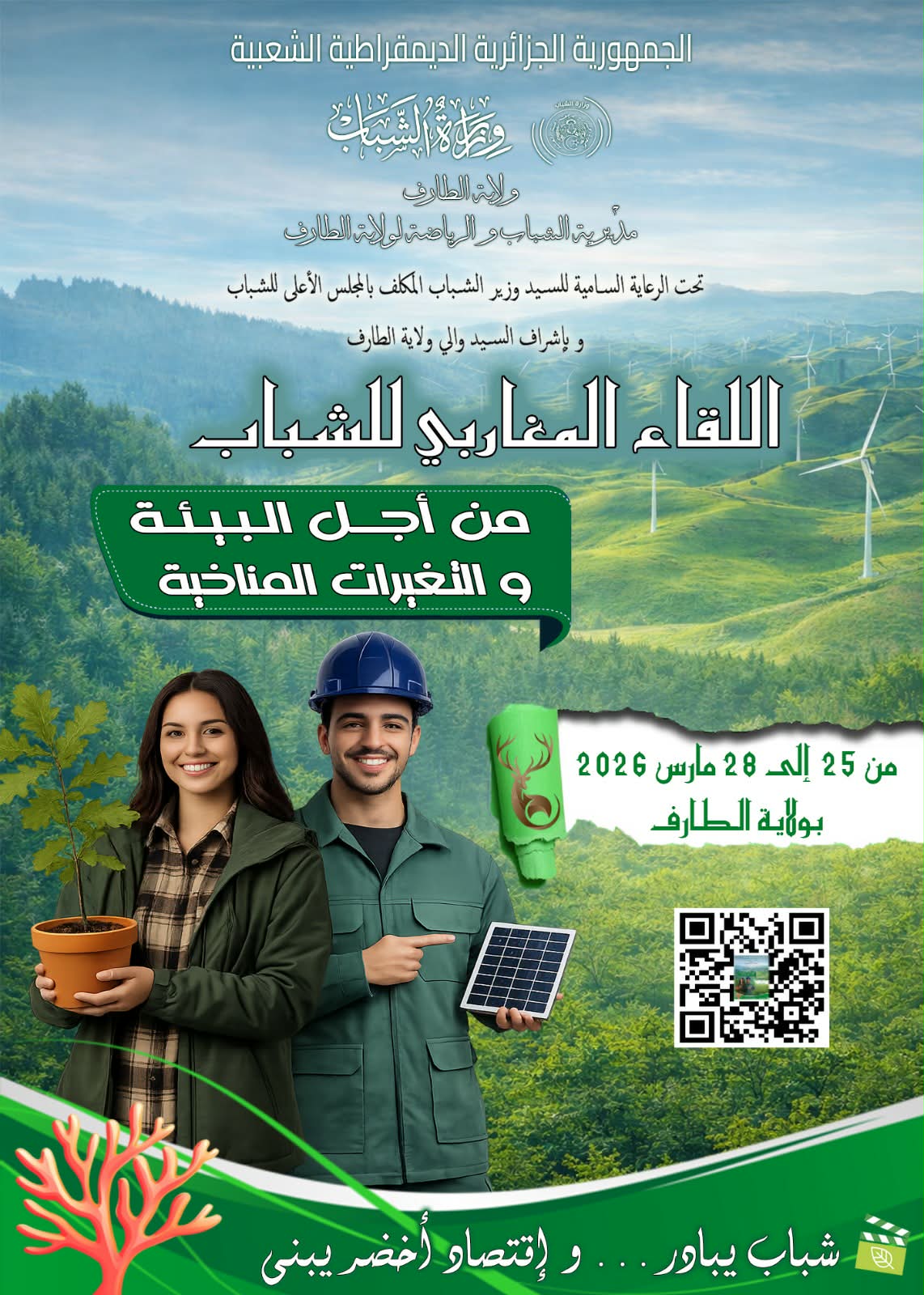 في سياق التحولات البيئية المتسارعة وما تفرضه من تحديات على المستويين الإقليمي والدولي، تحتضن ولاية الطارف، من 25 إلى 28 مارس 2026، الطبعة المغاربية للقاء الوطني للشباب حول البيئة والتغيرات المناخية، تحت الرعاية السامية للسيد وزير الشباب المكلف بالمجلس الأعلى للشباب، وبإشراف السيد والي الولاية، في مبادرة تعكس توجه الدولة نحو إشراك الشباب في قضايا التنمية المستدامة.