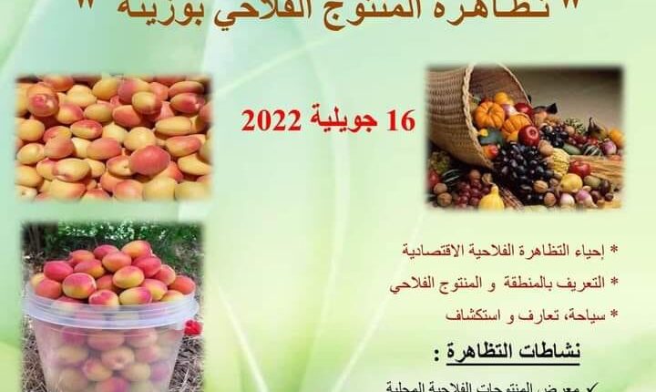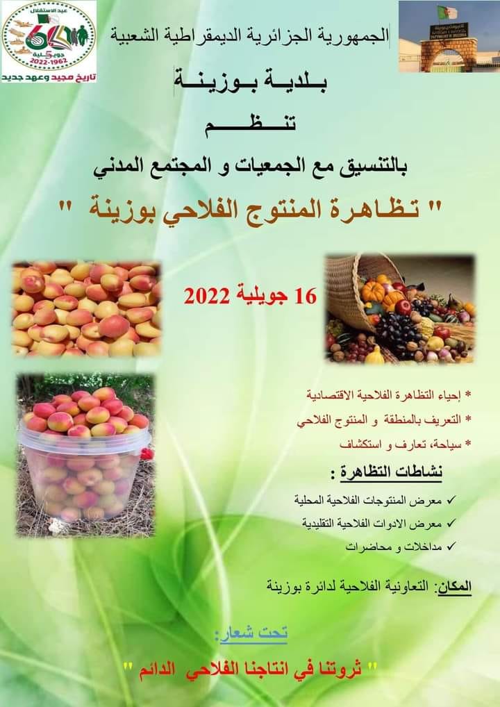 نظمت أول أمس،بلدية بوزينة بالتنسيق مع الجمعيات والمجتمع المدني، تظاهرة للمنتوج الفلاحي الخاص بالمنطقة،وكان ذلك بمركز التعاونية الفلاحية بالدائرة،النشاط تضمن إحياء التظاهرة الفلاحيةالإقتصادية والتعريف بالمنطقة ومنتجاتها ، كالمشمش والخوخ والتفاح والعسل وعديد المنتجات الفلاحية التقليدية ، هذا وقد حضر اللقاء مختلف السلطات المدنية على رأسهم رئيس المجلس الشعبي الولائي ” احمد بومعراف ” .