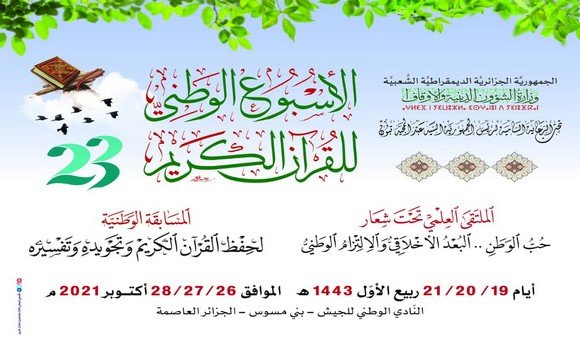 المسابقة التصفوية الوطنية المؤهلة للأسبوع الوطني للقرآن الكريم في طبعته ال25، تجري عن طريق تقنية التحاضر المرئي عن بعد وتخص ستة فروع،ويشارك فيها 200 متسابق من جميع ولايات الوطن،وذلك بإشراف لجنتين للتحكيم “.