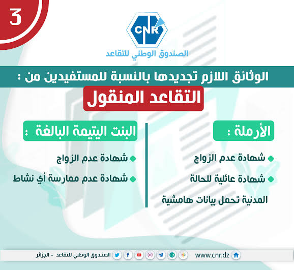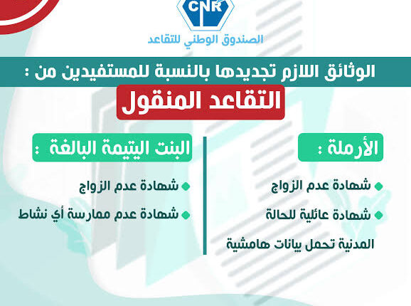 ونشر الصندوق،في بيان عبر حسابه على فيسبوك،الوثائق الثبوتية التي يجب تجديدها من طرف المستفيدين من منحة أو معاش التقاعد في شهر جانفي.