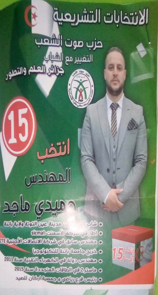 أما المهندس الشاب ذو 33 سنة ابن مدينة عين التوتة، مدينة الشهداء، زف بتحية للجميع بمختلف أطيافهم، شاكرهم على الدعم و المساندة، وأن ترشحه جاء بشعار بدل أن تلعن الظلام أشعل شمعة، وإن إعطاء فرصة لهذه الإطارات التي نلتمس الخير إن شاء الله، وأن النائب البرلماني دوره محدود ، و الشعب ينادي أين هي النخبة ؟ وقائمة صوت الشعب رجالا ونساء سيعملون بكل إخلاص للنهوض بالولاية ، وبرنامجنا طموح نسعى به إلى طرح الحلول و السبل من أجل دفع وتحسين المعيشة و التنمية ، وتكافئ الفرص من أجل بناء مستقبل مشرف، ويضيف محدثنا أن لو يحتفظ النائب براتبه في عمله السابق هكذا نكون صادقين في خدمة الوطن، أما فيما يخص الحصانة فهو مبدأ أن النائب محمي ، حيث يفتح كل القضايا الحساسة ويرافع دون خوف أو تردد من المتابعات ، لكن الحصانة أصبحت متبوعة لرجال المال و الأعمال للحفاظ على مصالحهم.