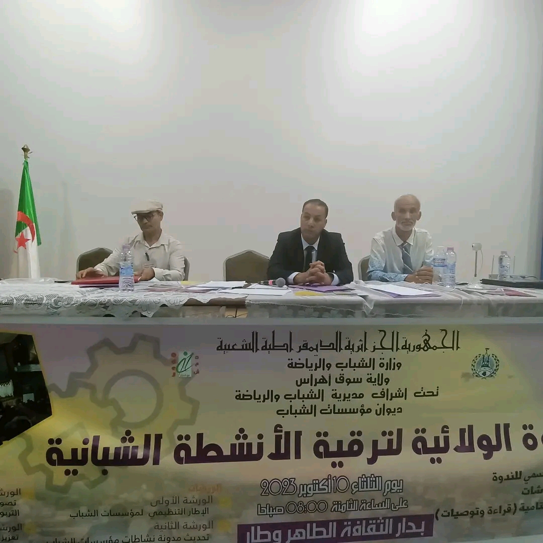أشرف عبد الكريم زيناي والي ولاية سوق أهراس على افتتاح الندوة الولائية لترقية الأنشطة الشبانية بدار الثقافة الطاهر وطار ببلدية سوق أهراس، المنظمة من طرف مديرية الشباب والرياضة، بمعية السادة رئيس المجلس الشعبي الولائي، أعضاء اللجنة الأمنية، رئيسي الدائرة والبلدية، أعضاء الهيئة التنفيذية، العضو المحلي للمجلس الأعلى للشباب، وبحضور عدد معتبر من الشباب.
