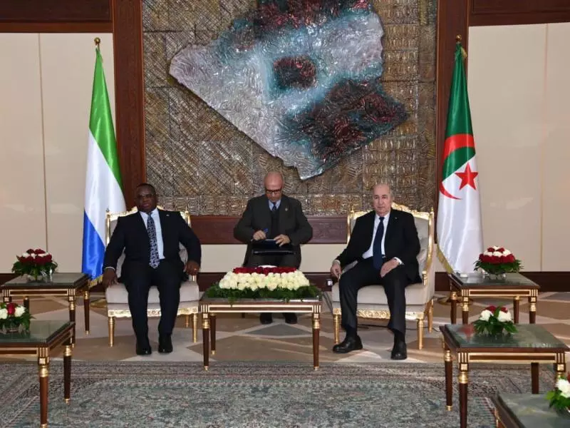 تحادث رئيس الجمهورية، السيد عبد المجيد تبون، اليوم الأربعاء، مع نظيره السيراليوني، السيد جوليوس مادا بيو، الذي يقوم بزيارة رسمية الى الجزائر تدوم ثلاثة أيام.