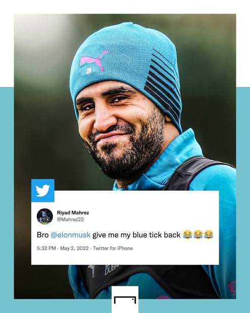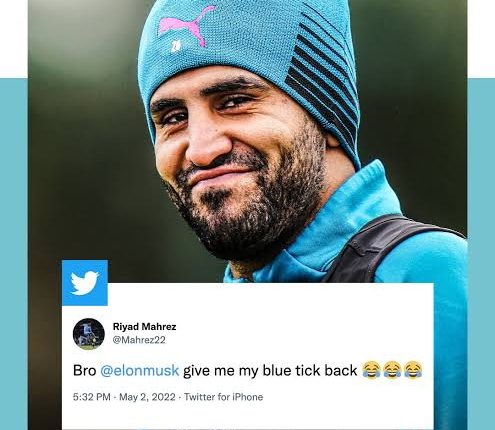 وجَّه الدولي الجزائري، رياض محرز نجم نادي المان سيتي  الإنجليزي، رسالة تحدٍّ قوية للملياردير الأمريكي، إيلون ماسك، مالك منصة التواصل الاجتماعي “تويتر“، أكد من خلالها أنه لن يرفض الدفع لشركة “تويتر” مقابل الحصول على علامة توثيق الحسابات الزرقاء، مشيرًا إلى أنه لا يهتم ، بعد أن جرى سحبت الشارة من حسابه.
