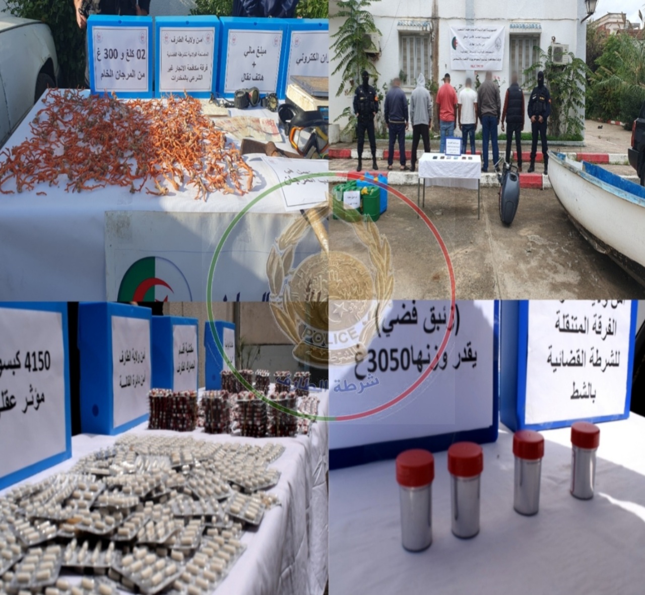 في مجال مكافحة الاتجار غير المشروع بالمخدرات والمؤثرات العقلية، تمكنت المصالح المختصة من معالجة 1964 قضية، وحجزت ما يزيد عن 66500 قرص مهلوس من أنواع مختلفة، بالإضافة إلى 3.2 كيلوغرامات من الكيف المعالج و97