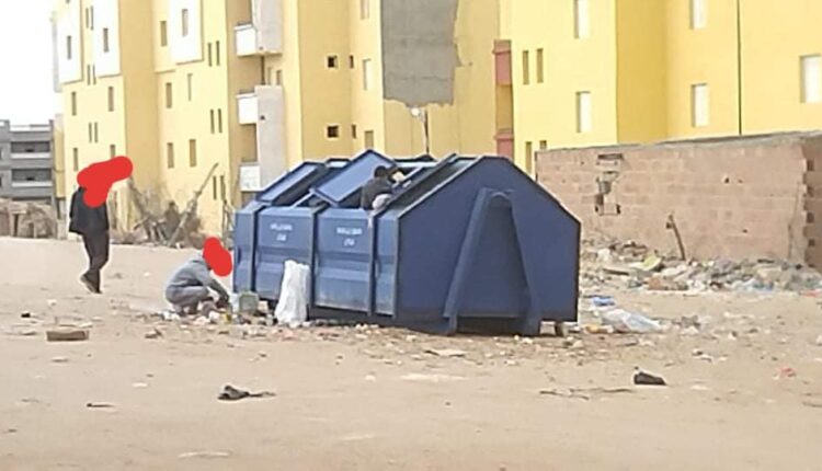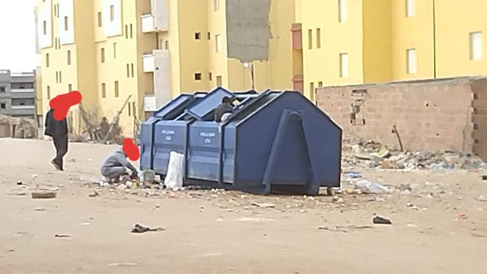 أطفال داخل حاويات رمي القمامة لجمع القارورات البلاستيكية