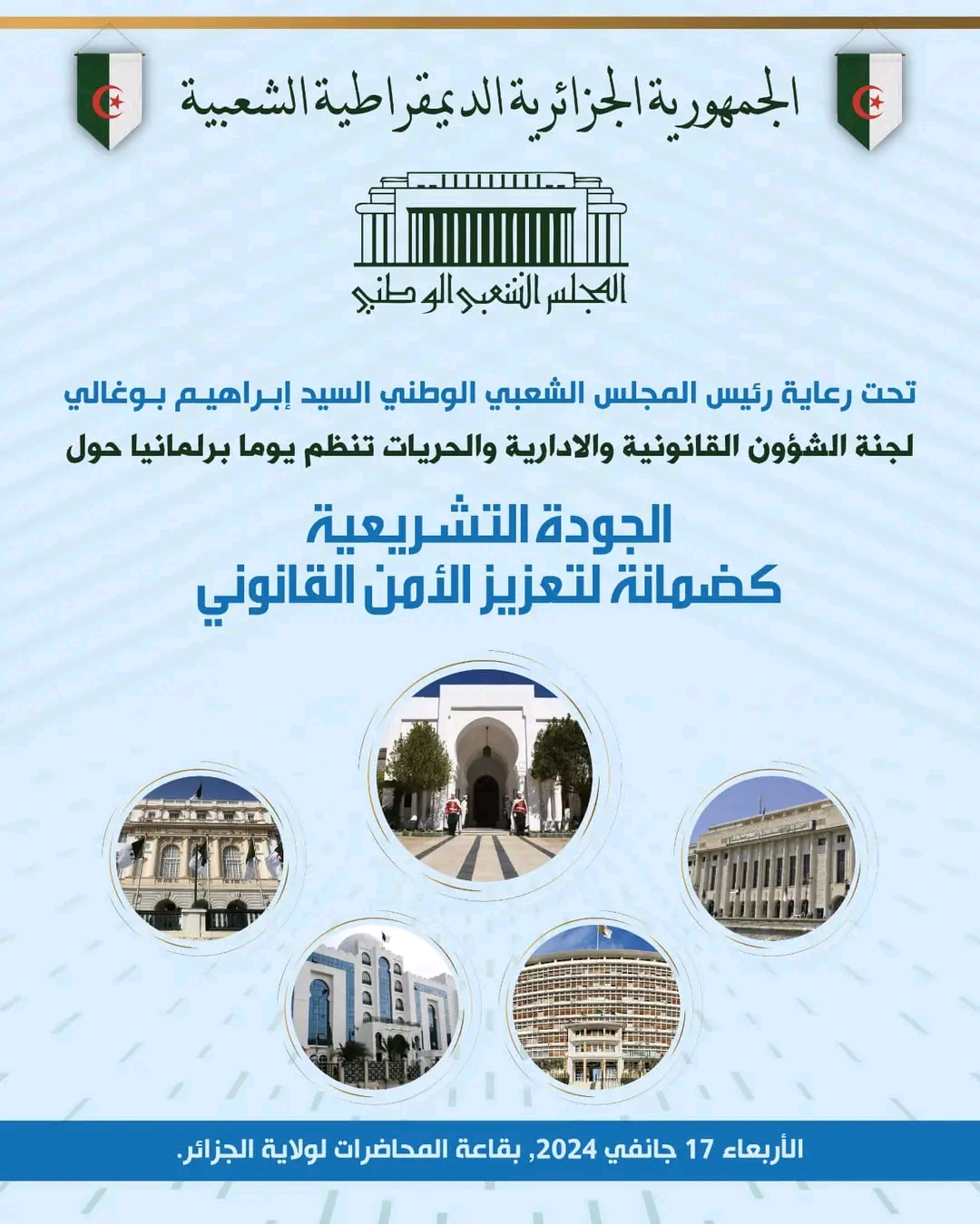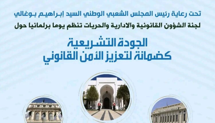 تنظم لجنة الشؤون القانونية والإدارية والحريات للمجلس الشعبي الوطني، اليوم بالجزائر العاصمة، يوما برلمانيا تحت عنوان: “الجودة التشريعية كضمانة لتعزيز الأمن القانوني”، حسبما أفاد به، يوم أمس، بيان للمجلس.
