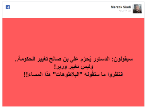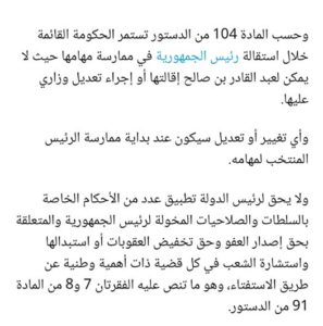 فبحسب المادة 104 من دستور 2016، لا يمكن لرئيس الدولة إقالة الحكومة القائمة أو تعديلها أو حل البرلمان أو الدعوة لانتخابات تشريعية مبكرة، حيث تقول المادة بالحرف “لا يمكن أن تُقال أو تعدل الحكومة القائمة إبان حصول المانع لرئيس الجمهورية أو وفاته أو استقالته حتى يَشرَع رئيس الجمهورية الجديد في ممارسة مهامه”.